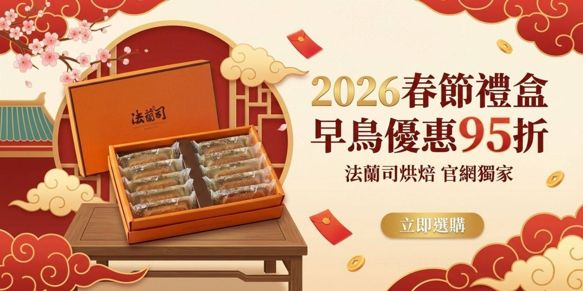🎉共慶「2026新年」🎉1.優惠內容:購金典禮盒享限時95折,全館滿1199即享免運,會員再享專屬紅利回饋2.歡迎加購手寫明信片,備註留言您的新年祝福,由我們替您送達收件者~3.宅配到貨日期:如僅購買禮盒產品,運送方式可選擇「黑貓宅配快速到貨」,並請在下單頁面指定到貨日期,或備註說明特別需求,我們會儘量為您安排,以應送禮時程。4、活動期間:即日起~年前*官網訂購禮盒內容恕無法混搭或是更改*產品為手工製作,運送過程有易碎風險,下單視同願意承擔此可能性*法蘭司烘焙保有活動的最終解釋權