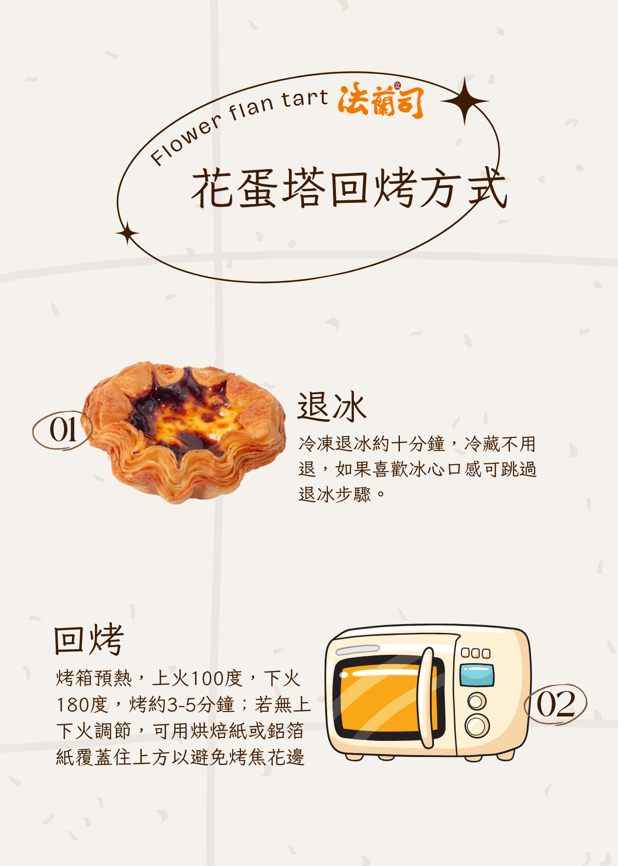 | 注意事項!很重要,購買前請閱讀~ | 花蛋撻官網購買為冷凍宅配出貨,會將現烤蛋撻送入-25度急速冷凍。到貨後請送至冰箱維持冷凍保存,有以下三種食用方式根據自己的喜好選擇。 1、冷凍取出即食,內餡將會呈現雪糕的口感,適合喜歡偏硬口感的您。 2、冷凍取出放置常溫退冰,若斷面呈現光澤即可食用,此時口感如冰淇淋般柔軟,適合喜歡偏軟且愛吃冰爽口感的您。 3、冷凍取出放置常溫退冰,之後徹底回烤,千層酥皮釋出香味,蛋撻內餡回覆剛出爐的Q軟,適合喜歡偏軟且愛吃溫熱口感的您。 |
